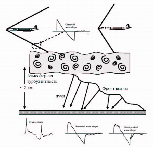 Очень важным фактором при распространении волны звукового удара в атмосфере является слой атмосферной турбулентности, расположенный на высоте до 3-х км над поверхностью земли. Для акустической волны неоднородности скорости потоков воздуха в турбулентной среде играют роль фокусирующих и дефокусирующих линз. Волновой фронт N-волны искажается, образуются области случайных фокусировок поля, и это может привести к значительному увеличению акустического давления у поверхности земли. В случае полета без маневров (наиболее длительная часть полета) именно турбулентность формирует структуру акустического поля звукового удара. Наблюдаются волны самой различной формы: волны с закругленным ударным фронтом, волны с несколькими пиками и ударными фронтами (Рис.2). В областях фокусировок образуется так называемая U-волна с большой амплитудой (название идет от схожести профиля волны с латинской буквой U).