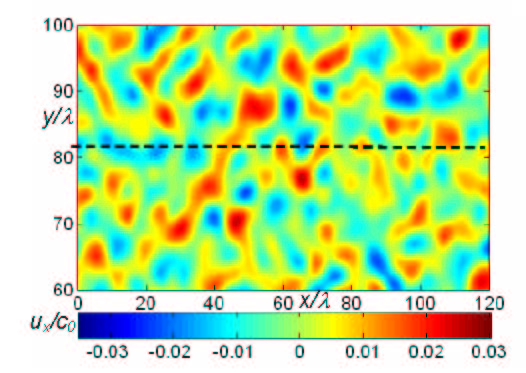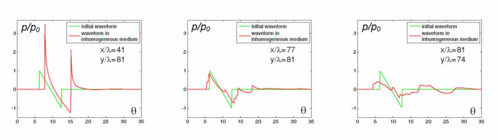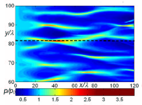 При численном моделировании распространения волны звукового удара в турбулентной среде используется нелинейное параболическое уравнение, позволяющее описать воздействие на акустическую волну нелинейных, диссипативных и дифракционных эффектов, а также эффектов, связанных с наличием неоднородностей среды. Для моделирования турбулентного поля используется метод случайно ориентированных мод Фурье с заданным энергетическим спектром (рис.6). Результаты моделирования показали, что структура акустического поля N-волны в случайно-неоднородной среде действительно очень сложна. После похождения областей, где скорость движения среды направлена против распространения волны (синий цвет на рис.6), наблюдается фокусировка волны, т.е. возникают области с повышенной амплитудой давления (рис.7). Повышенные амплитуды наблюдаются и на больших расстояниях, несмотря на сильное нелинейное поглощение и диссипативные эффекты. На рис. 8 показаны профили нелинейной N-волны в турбулентной среде. Как и в реальной атмосфере, они имеют самую разнообразную форму. К примеру, U-волны (рис.8а) с большой амплитудой и очень узким ударным фронтом образуются в областях, где акустическая волна фокусируется. Амплитуда такой волны может в несколько раз превышать амплитуду начального импульса. Подобные быстрые перепады давления могут представлять опасность. Численное моделирование показывает также формирование акустической волны с несколькими ударными фронтами (рис.8б) и волны с закругленным положительным полупериодом. У такой волны ударный фронт практически отсутствует. Общая картина изменения формы акустической волны, проходящей вдоль пунктирной линии на рис.2, представлена в видео файле (900 Kб).