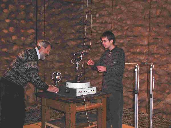 | Н.С.Виноградов и А.О.Шилкин проводят в заглушенной камере испытания параметрических излучателей ультразвука |