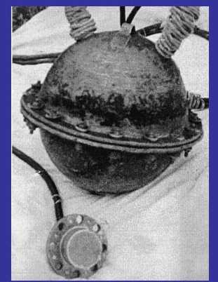 На рубеже 40-50-х годов на кафедре акустики при участии В.А. Добросклонского и аспиранта С.Н. Ржевкина В.В. Филипкова был изготовлен звукоприемник, который представлял собой полую сферическую оболочку с гибкой пластиной, на которую были наклеены кристаллы сегнетовой соли (рис.1). Уже первые экспериментальные результаты по регистрации в море инфразвуковых волн (с частотами порядка нескольких герц), вызванных штормом на расстоянии сотен километров с помощью приемников нового типа, полученные в 1951 г. В.В. Филипковым, свидетельствовали о перспективности использования этих звукоприемников для практической гидроакустики. Однако возникла необходимость в строгом теоретическом обосновании работы приемника в различных гидроакустических ситуациях.