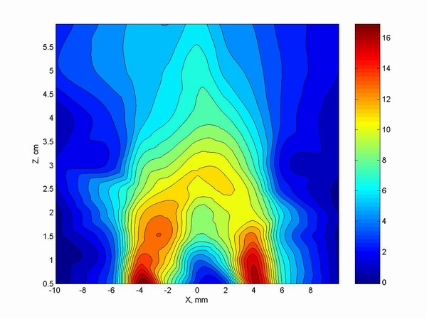 Ниже представлена картина поля скорости струи, полученная от двух отверстий.